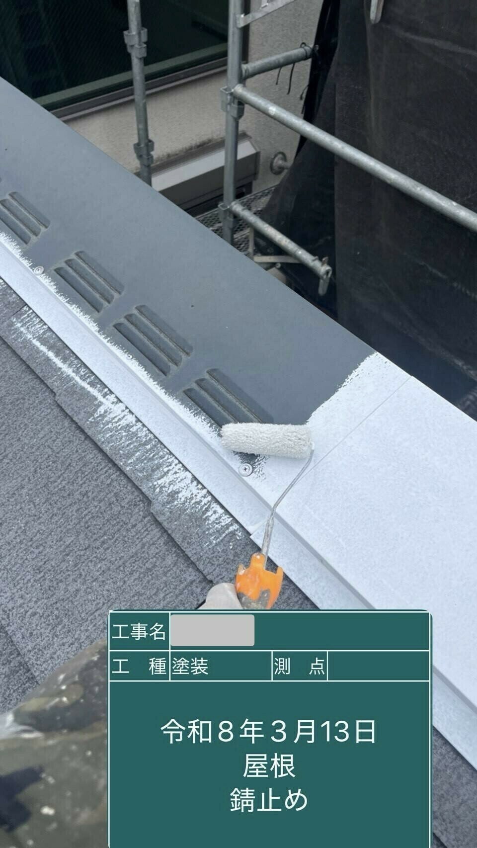 次に雪止め、棟板金などに錆止めを塗ります。